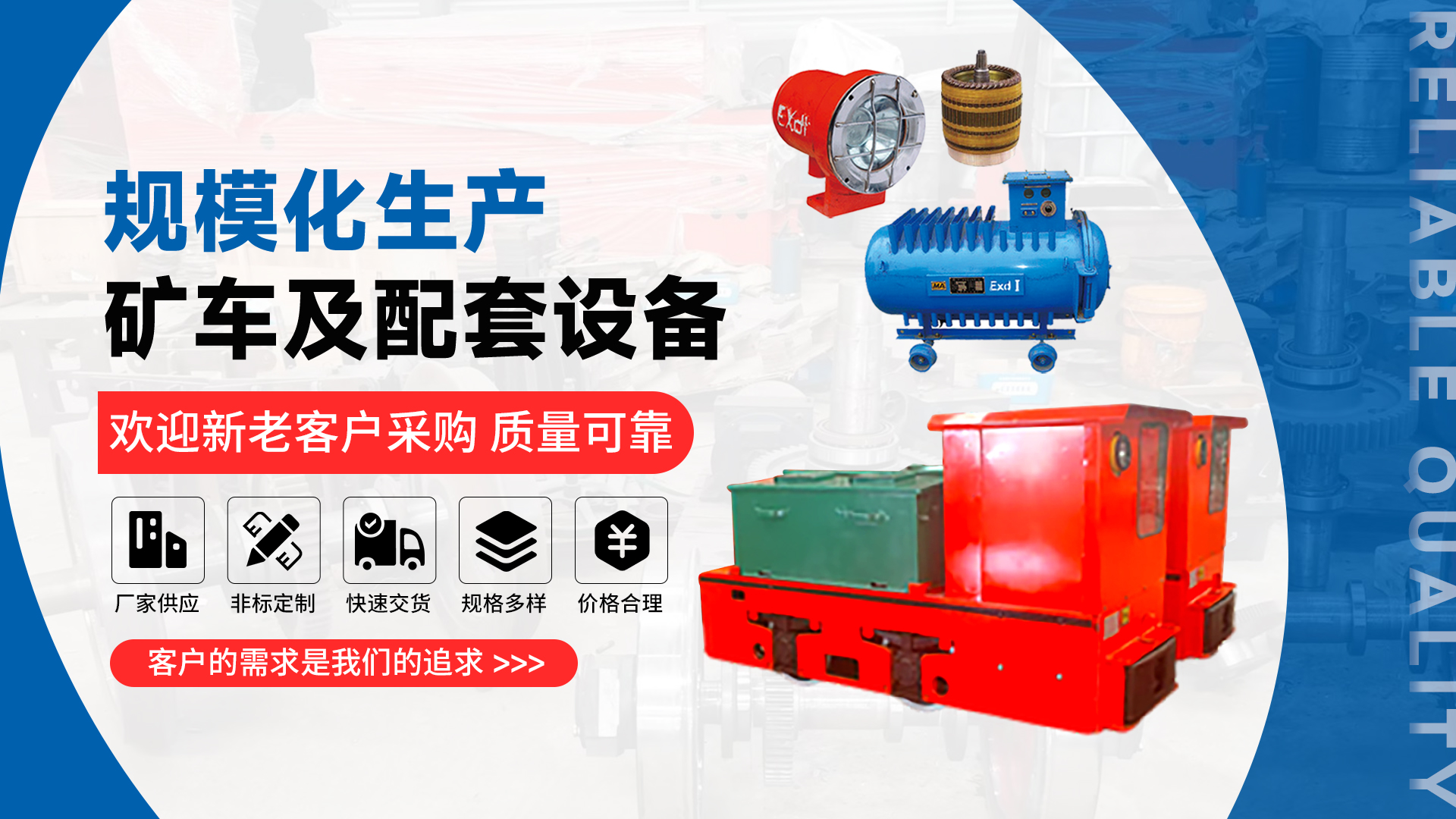 本公司是集机械生产与电气制造于一体的高科技企业,是矿用机电设备及其配套产品的专业生产厂家,技术力量雄厚,制造设备齐全,在同行业中检测手段具备领先水平,具备了规模经营生产的能力,主导产品有矿用电机车,矿用电瓶车,矿车及配套设备等。公司自成立以来,一直注重加强质量管理和质量保证体系建设,视产品质量为企业的生命,凭借先进的生产工艺,健全的质量控制机构和完善的售后服务体系,产品于2015年通过了 ISO9001质量管理体系认证。凭借过硬的产品质量和健全高效的营销网络,公司在内蒙古,河北,陕西,山西,甘肃,东北,云南,兰州等28个省市自治区都设立了销售处,与国内各大矿业集团形成了多年的供应关系。完善的质量保证体系,良好售后服务制度,使得我公司产品不仅覆盖全国,而且远销国外,深受广大用户的好评。